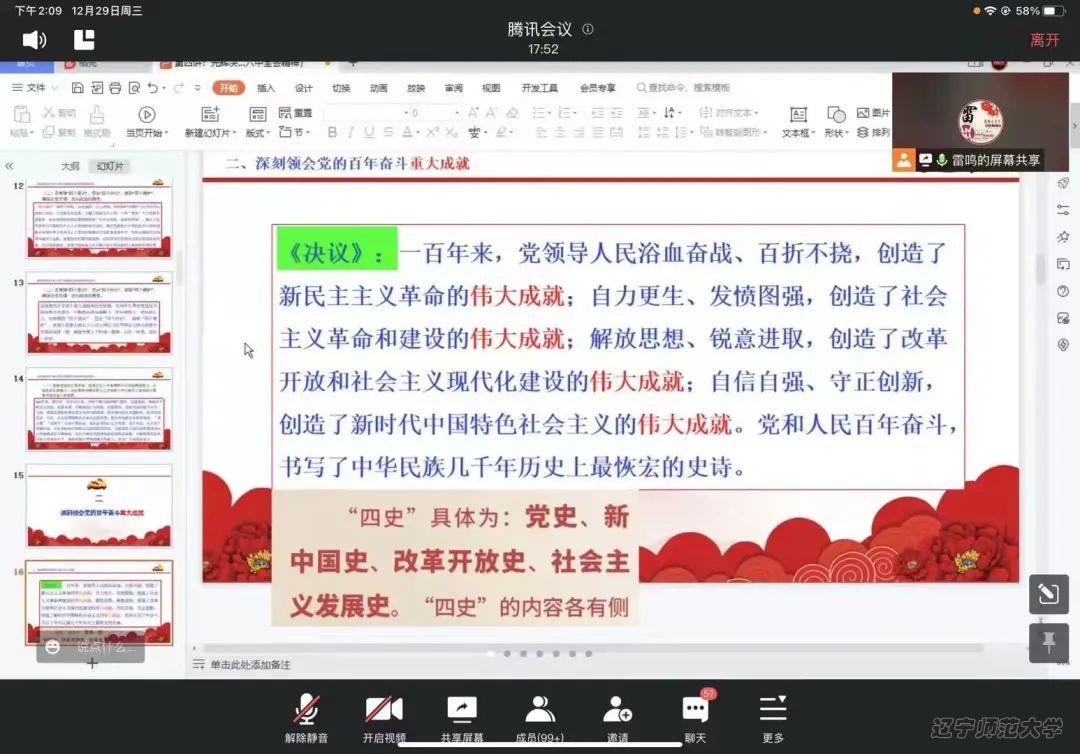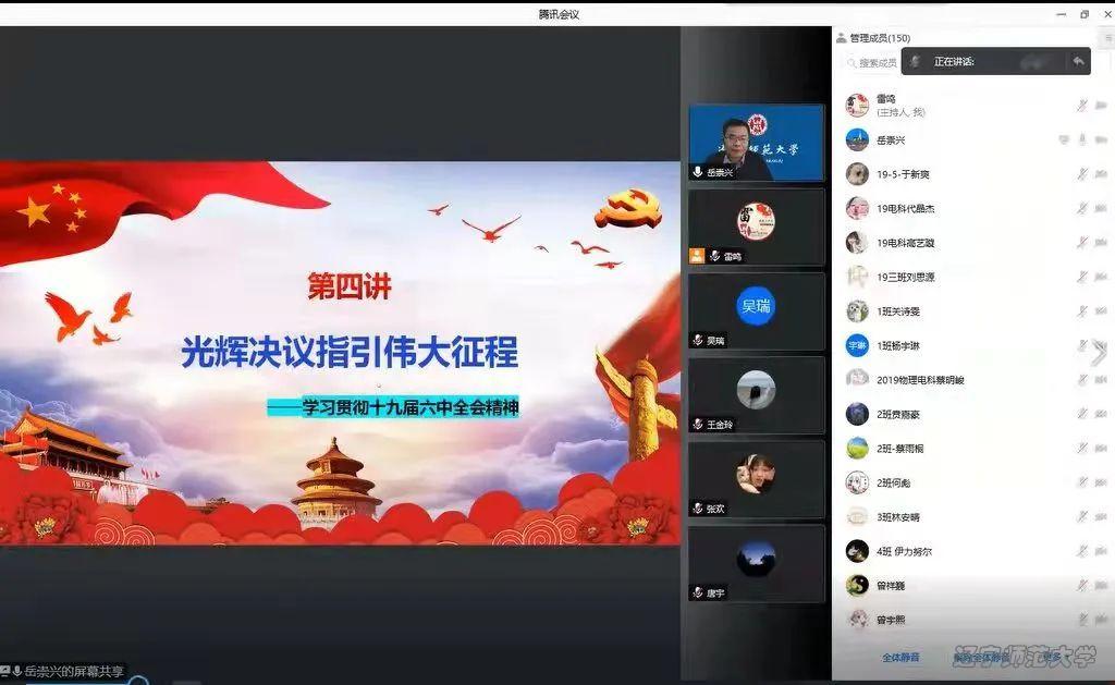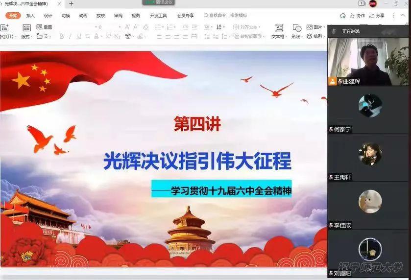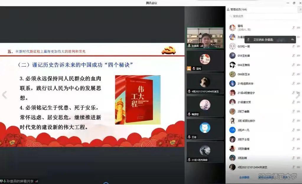 党委书记曲建辉、院长孙景昌、党委副书记雷鸣四位老师通过线上授课方式分别面向2019级、2020级、2021级、2018级本科生开展了党的十九届六中全会精神专题宣讲。