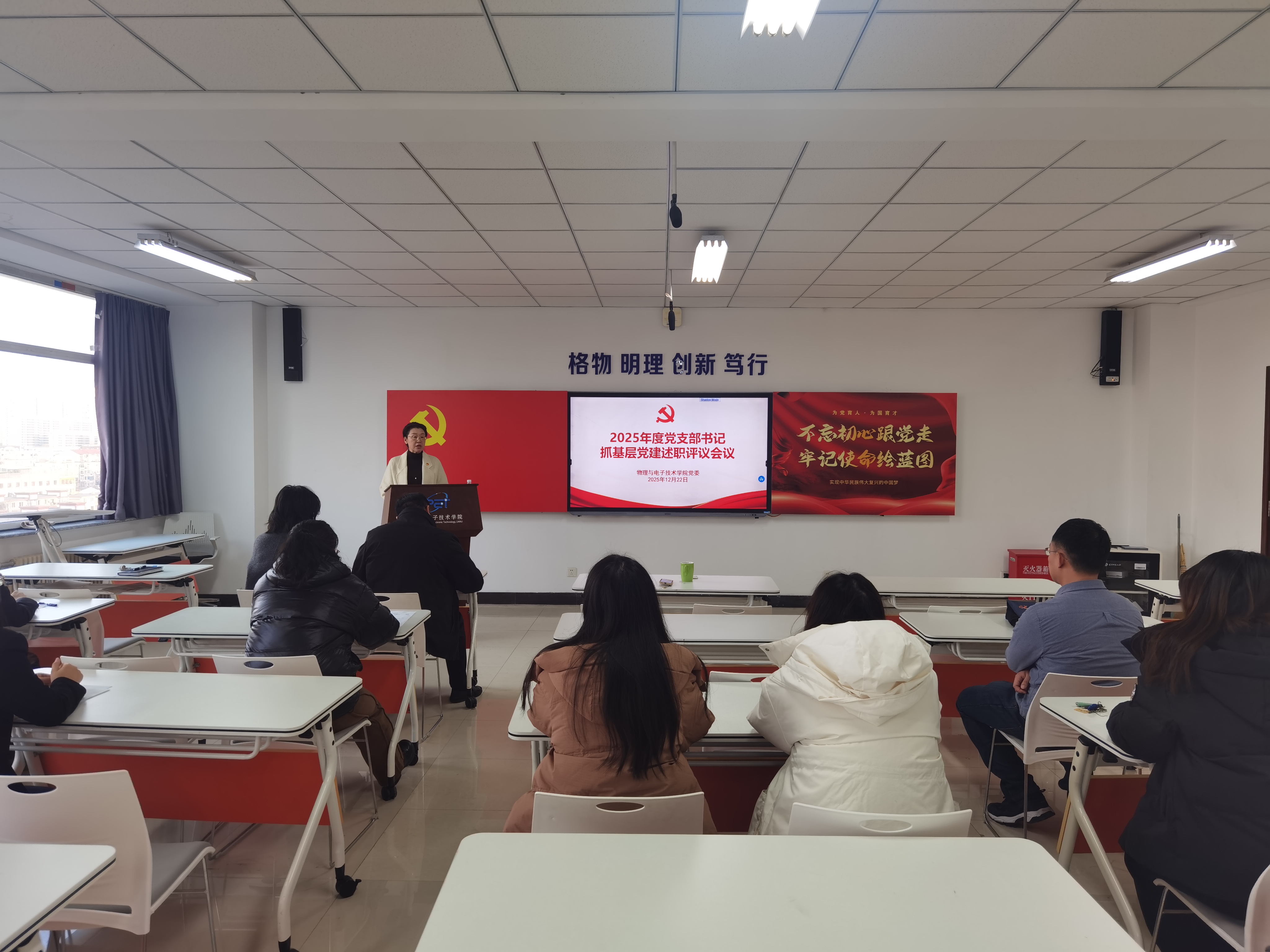 为全面落实新时代党的建设总要求,进一步拧紧基层党建责任链条,压紧压实党支部书记党建工作“第一责任人”职责,12月22日,物理与电子技术学院党委召开2025年度党支部书记抓基层党建述职评议会,会议由学院党委书记李凝主持,学院党委副书记雷鸣、全体党支部书记、支部委员、师生党员代表、民主党派教师代表参加了此次会议。