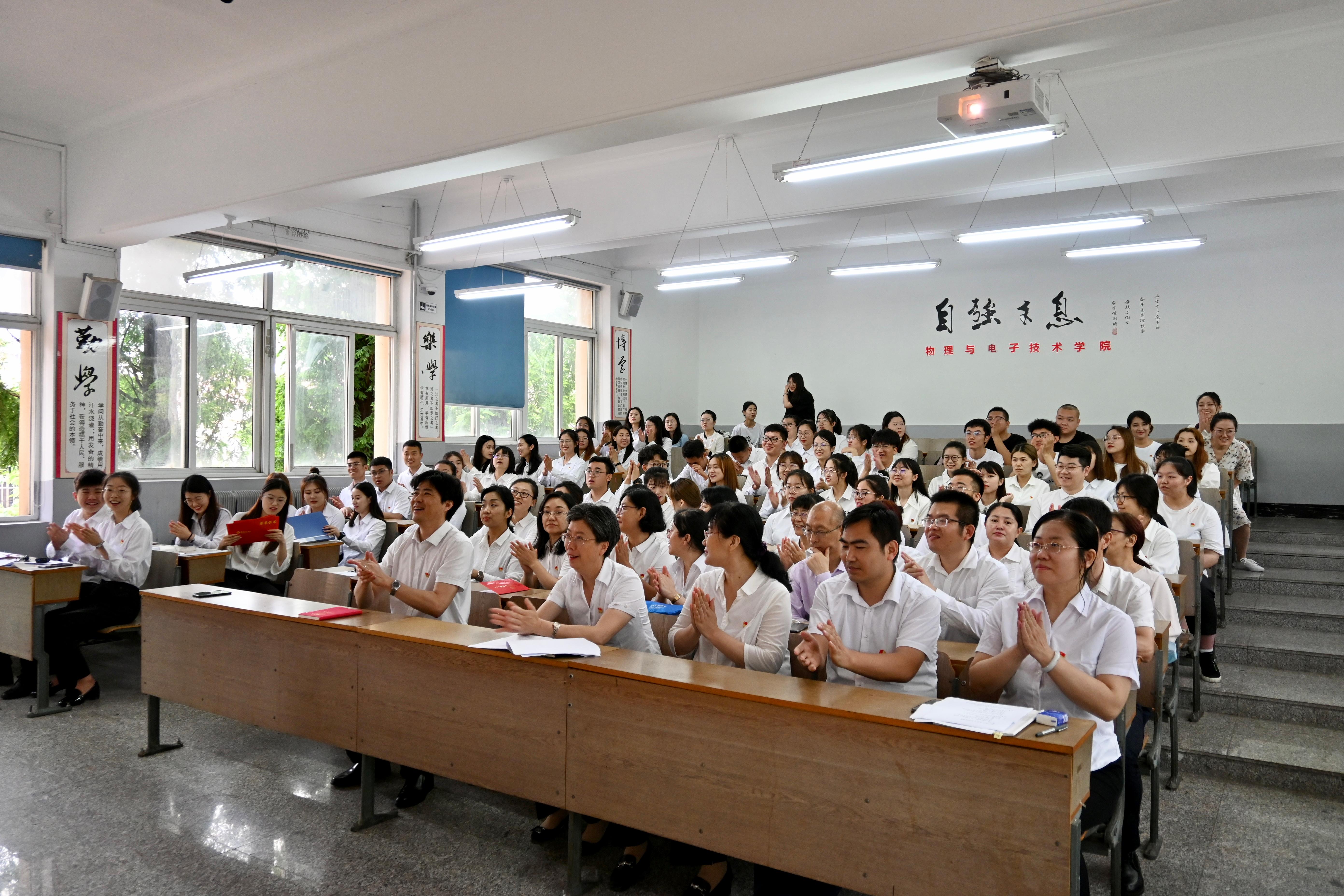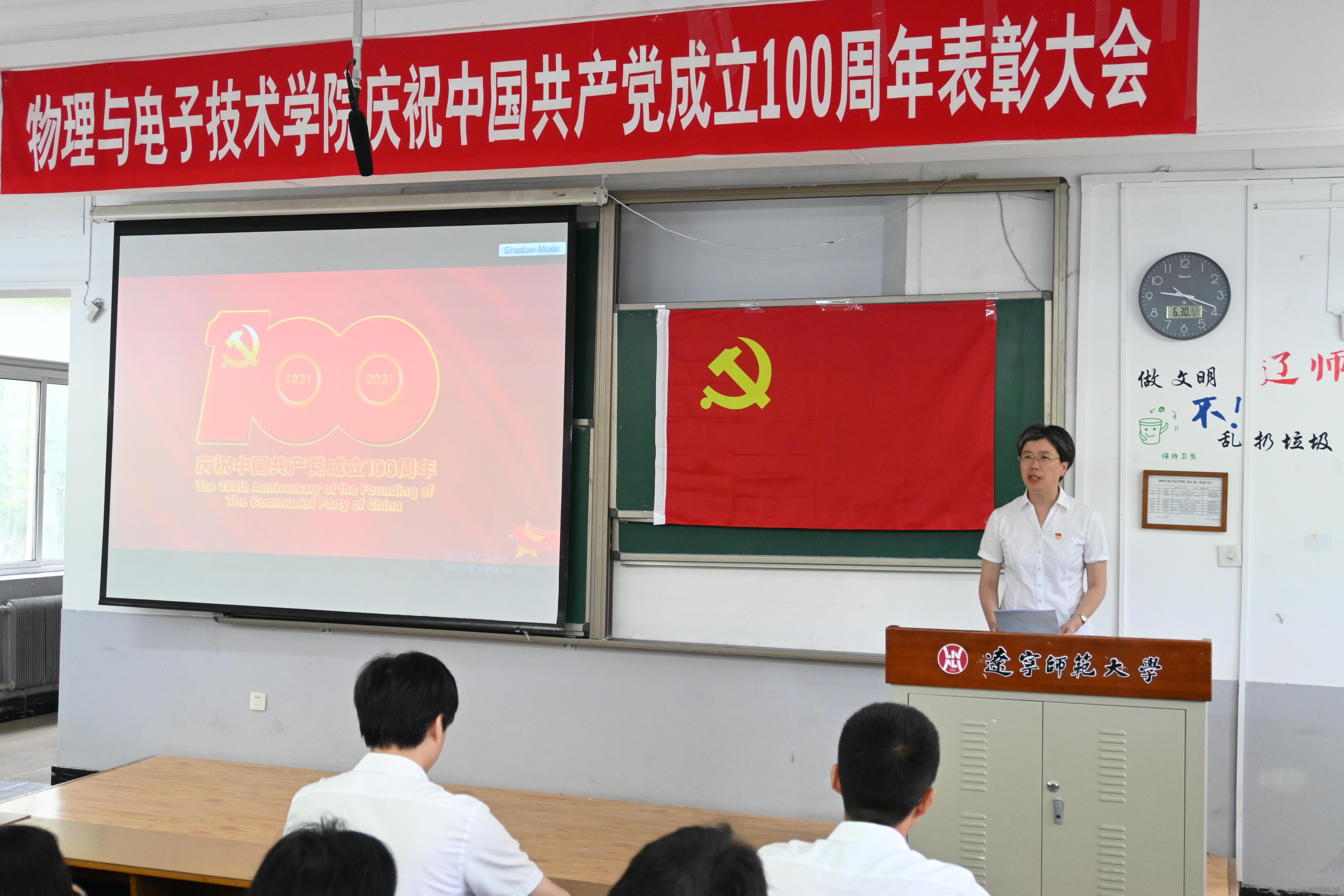 为庆祝中国共产党成立100周年、建校70周年,进一步推动全体党员不忘入党初心、牢记党员使命,引导广大党员永葆共产党人的先进性和纯洁性,6月30日上午,物理与电子技术学院举办庆祝中国共产党成立100周年表彰大会暨“永远跟党走”诗歌朗诵活动,出席大会的有:学院党委书记曲建辉同志、党委副书记、院长孙景昌同志、学院党委委员、班子成员、全体师生党员及获奖同学代表,表彰大会由学院党委副书记李孝君主持。